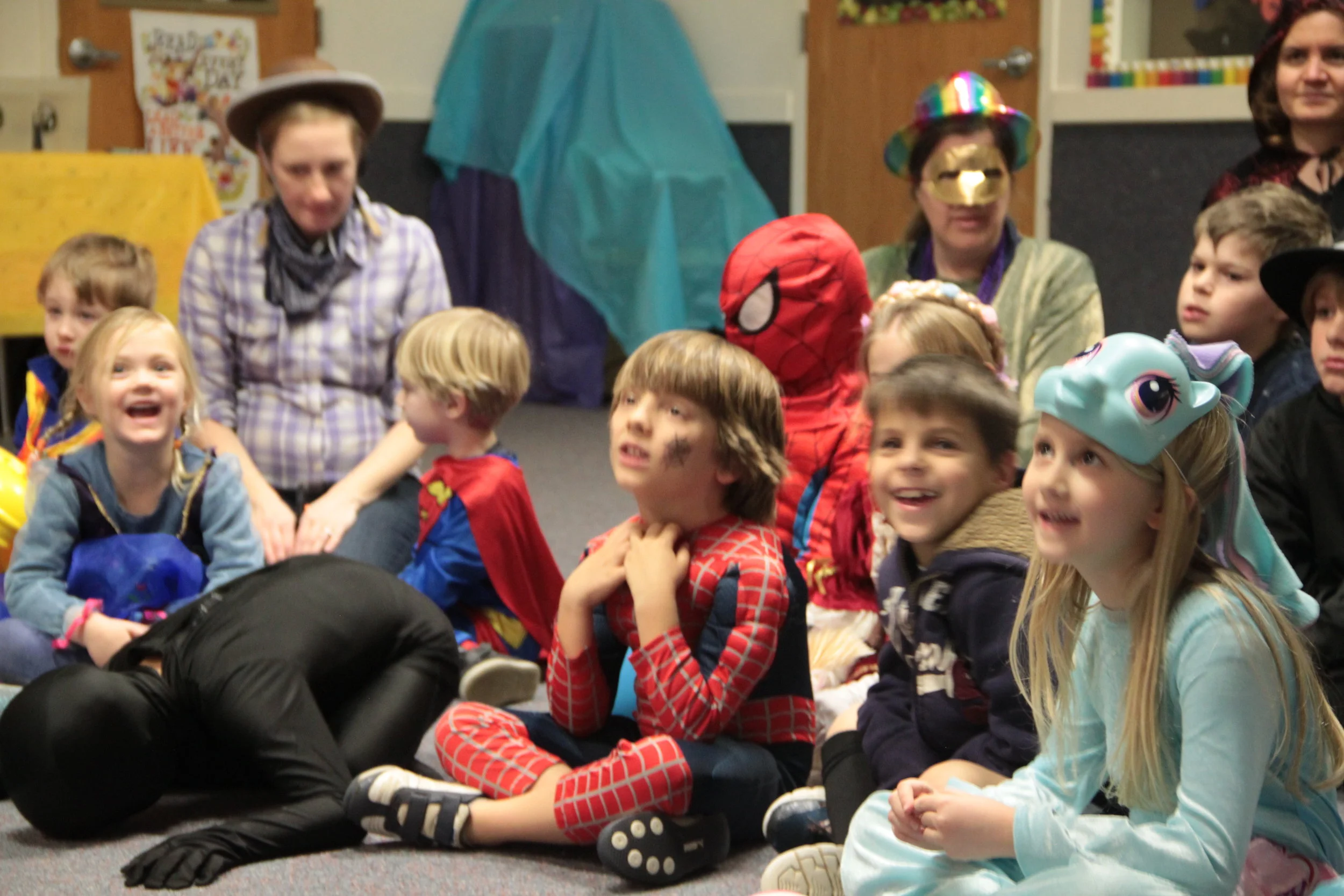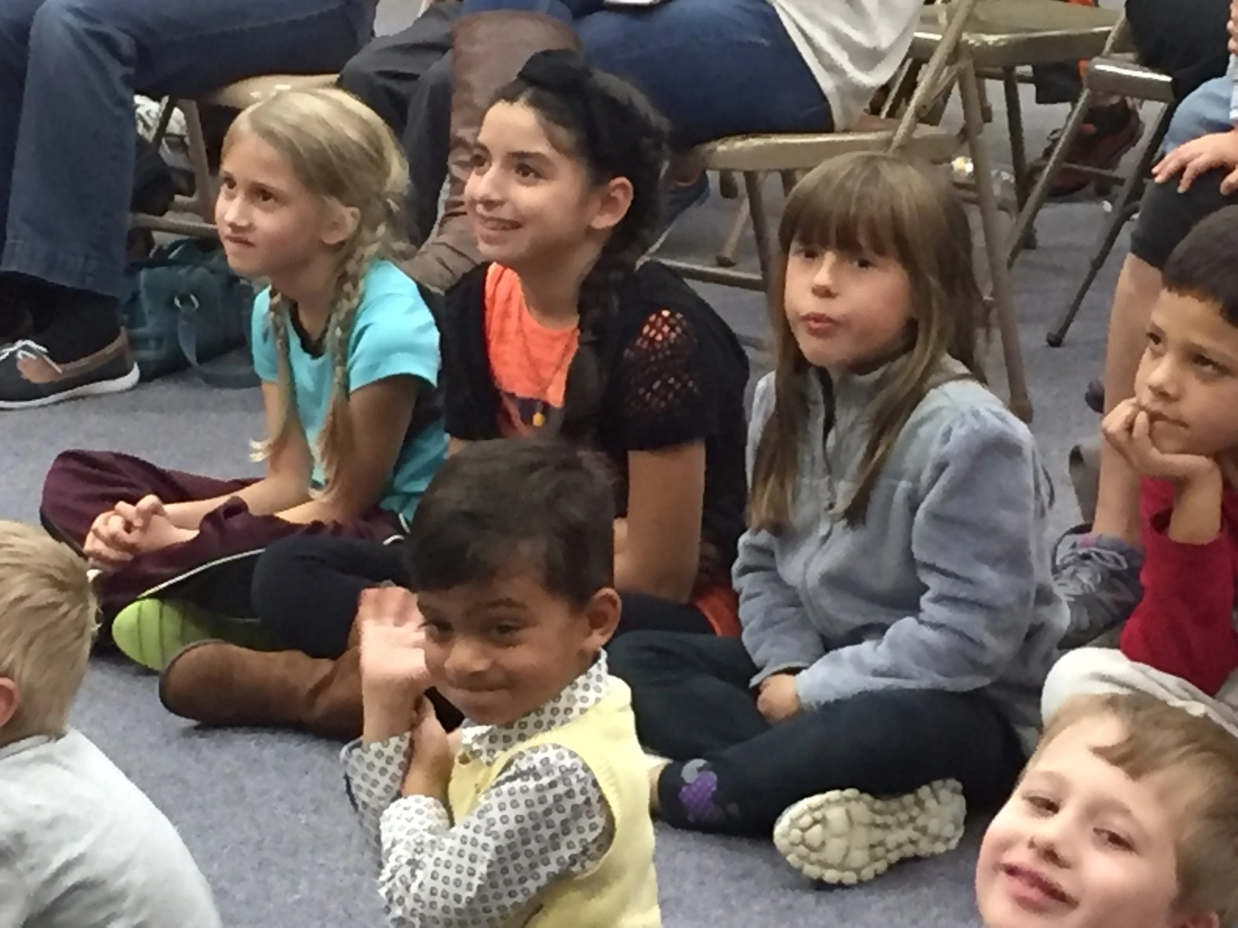 Criss-cross apple sauce as students listen to a presenter for a class program.